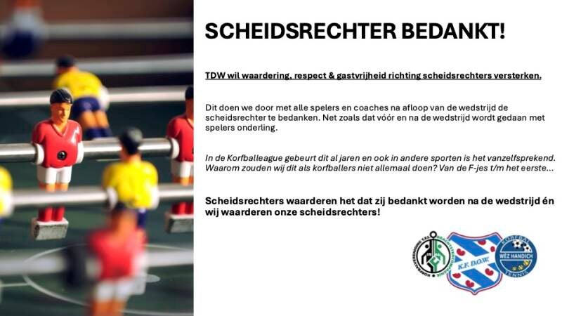 TDW wil waardering, respect & gastvrijheid richting scheidsrechters versterken. Dit doen we door met alle spelers en coaches na afloop van de wedstrijd de scheidsrechter te bedanken. Net zoals dat vóór en na de wedstrijd wordt gedaan met spelers onderling.