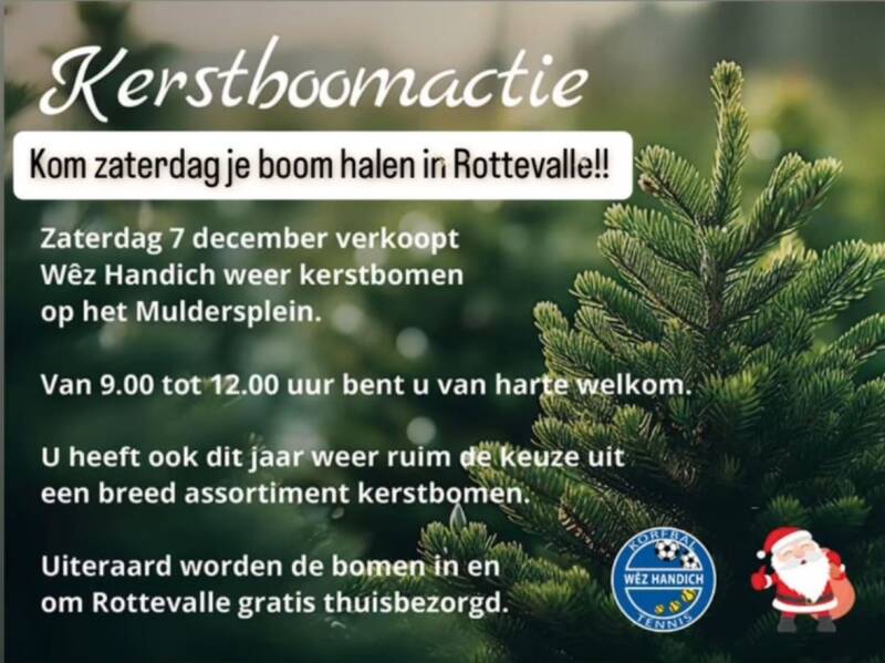 Kom zaterdag 7 december je boom halen in Rottevalle! Van 09:00 tot 12:00 u bent u van harte welkom op het Muldersplein om een kerstboom uit te zoeken. Uiteraard worden de bomen in en om Rottevalle gratis thuisbezorgd.