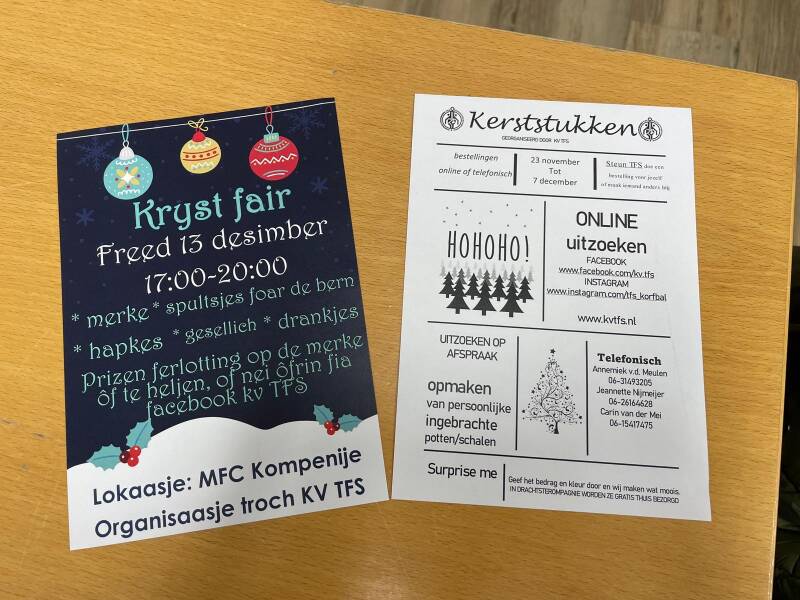 Vrijdag 13 december organiseert KV TFS haar Kerstfair van 17:00 tot 20:00 uur. Er is een markt, spelletjes voor de kinderen, hapjes, drankjes en gezelligheid. Prijzen van de verloting zijn af te halen, of na afloop via Facebook kv TFS.