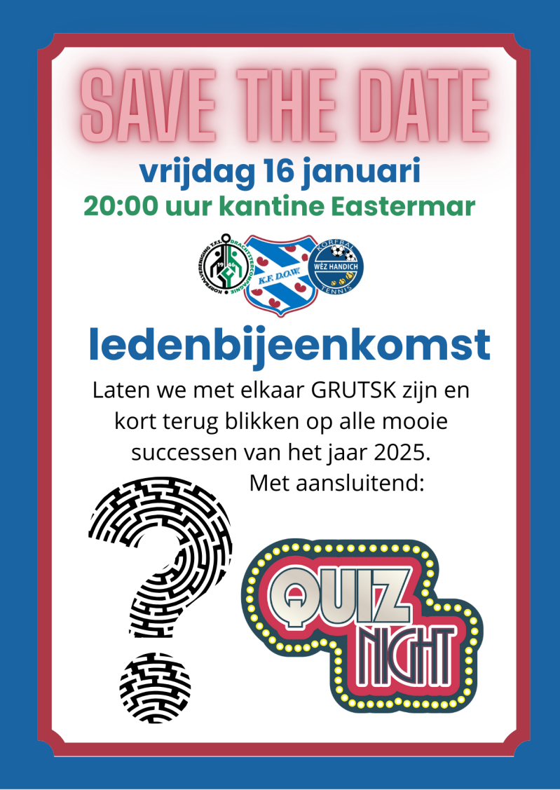 Noteer alvast in je agenda!! Op vrijdag 16 januari 2026 is er voor alle leden en/of ouders van leden een ledenbijeenkomst. Met een korte terugblik over 2025 en aansluitend wordt er een quizavond gehouden.
